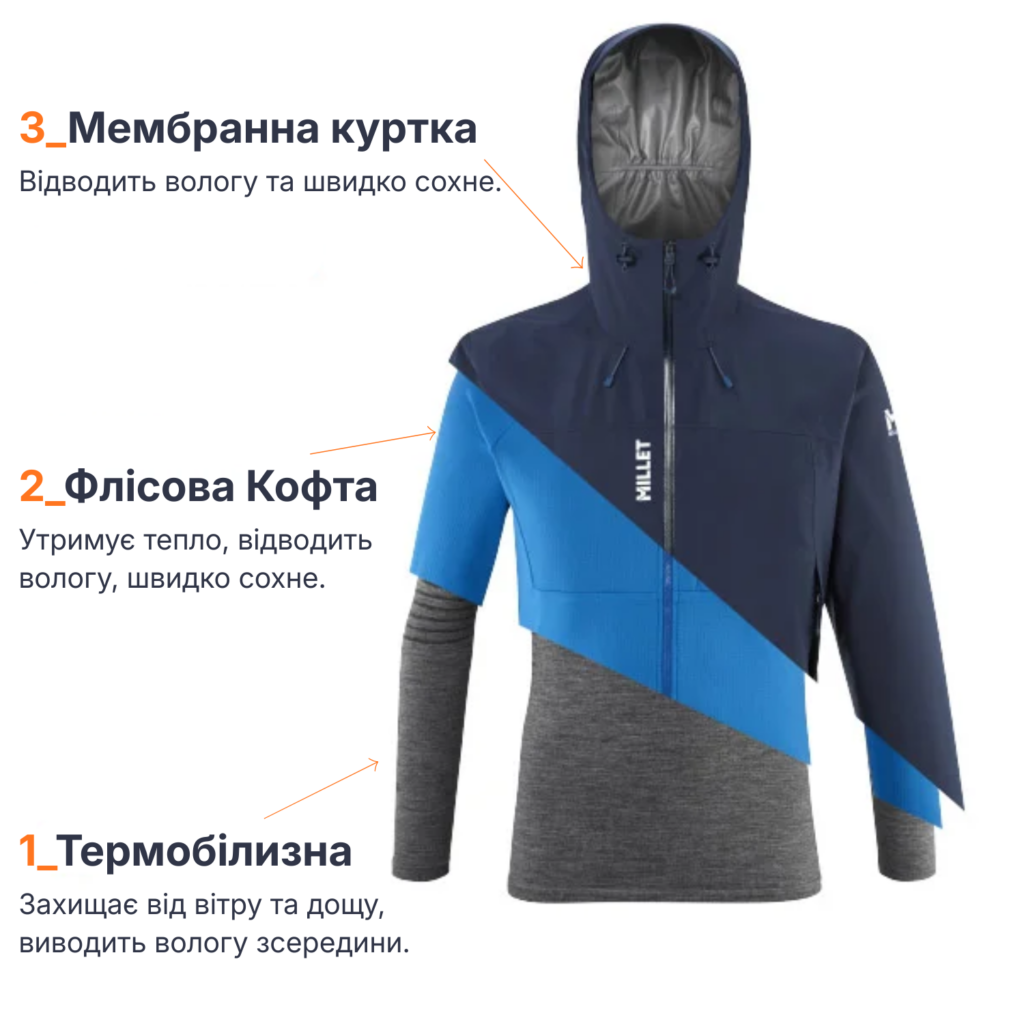 КУРТКА - бажано щоб у вас була мембранна куртка, яка захистить вас від вітру та дощу, якщо немає можна використовувати дощовик. |